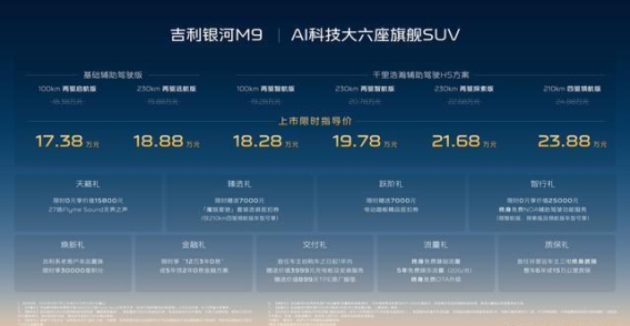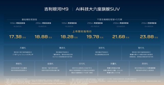此次银河M9推出六款配置,包括了不同续航和驱动方式的版本,分别为210km四驱领航版、230km两驱探索版、230km两驱智航版、100km两驱智航版、230km两驱远航版、以及100km两驱启航版。无论消费者对续航、动力,还是价格有怎样的需求,吉利银河M9都能提供相应的选择。购车者还将享受丰厚的购车优惠政策,涵盖从智能配件到金融服务等多个方面。