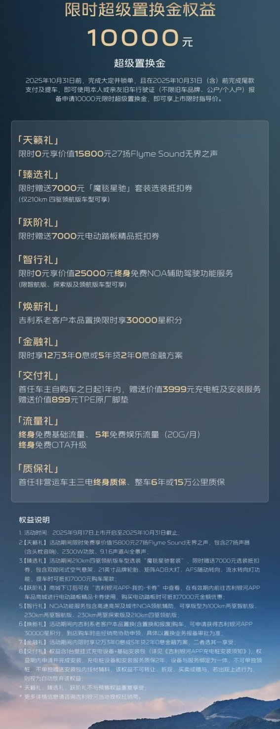 在座椅配置上,银河M9同样没有让人失望。主驾座椅支持主动侧翼支撑、16点按摩、加热、通风及头枕音响等多项功能,副驾座椅则配备了腿托、石墨烯加热与按摩通风功能,为乘客带来顶级舒适体验。而后排座舱的设计更为贴心,云感SPA座椅、9.1L冷暖冰箱、17.3英寸吸顶屏、27扬声器音响系统等配置,不仅提升了乘坐舒适度,也为长途旅行提供了更多便利。