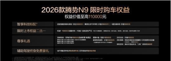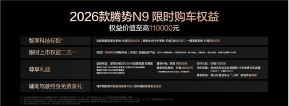 总体来看,2026款腾势N9凭借其卓越的性能、豪华的配置、领先的智能科技以及超高的安全保障,成为了大型SUV市场中的佼佼者。它不仅满足了现代消费者对豪华、舒适、安全和智能的多重需求,更为豪华SUV市场树立了新的标杆。无论是作为商用座驾,还是家庭出行的首选,腾势N9都以“出色 更出众”的产品实力,为车主提供了超越期待的驾乘体验。