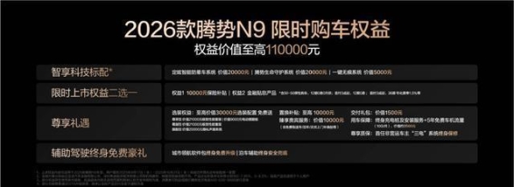 为了回馈广大消费者,腾势N9还推出了一系列限时购车权益,包括保险补贴、金融贴息以及高达45000元的智享科技赠品等。车主还可以选装智能电动门、吸顶屏、流媒体后视镜等豪华配置,个性化定制自己的座驾。无论是从价格、配置还是购车权益,腾势N9都充分考虑到了消费者的需求,展现了品牌对用户的深刻理解。