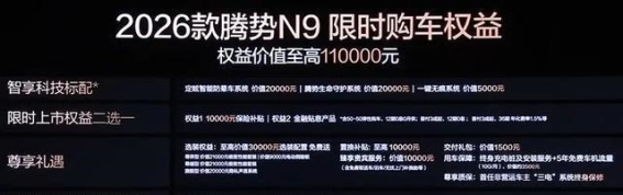 2026款腾势N9还新增了霜云茶、红雅金、蓝辰银、绿华银和紫瑢金等五款全新车身颜色,并首次引入双色车身设计,使消费者能够拥有更多的个性化选择。