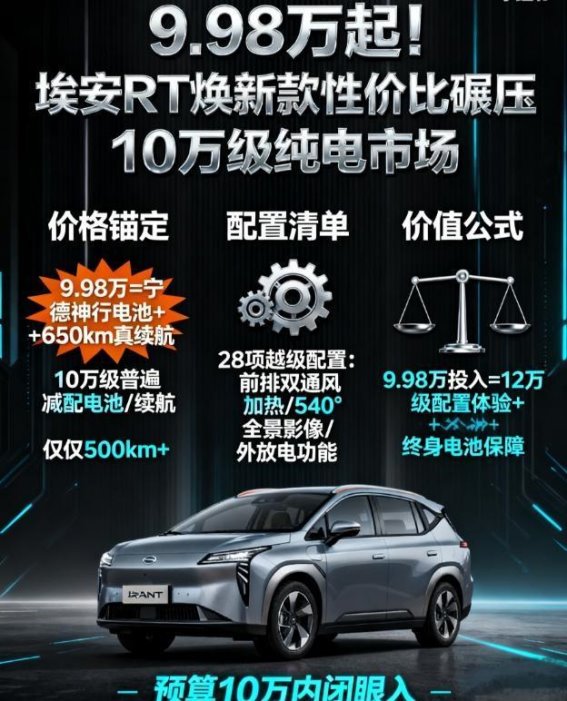 坐进埃安RT焕新款的那一刻,我的第一感觉就是:“这车绝对不止9万。”作为一款定价在9万级别的新能源车,埃安RT焕新款的表现远远超出了我的预期。从外观到配置,从续航到内饰,它的每一项细节都让人感到惊艳。尤其是在如今竞争激烈的汽车市场,这样的价格就能拥有如此出色的品质,实在是物超所值。