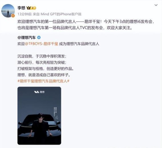今天上午,理想汽车通过官方微博宣布,易烊千玺正式成为品牌首位代言人。这一消息迅速引发热议,理想汽车的创始人兼CEO李想也在微博上转发并欢迎易烊千玺的加入。这一举措与李想此前多次公开表示“车主是最好的代言人”的言论形成了鲜明对比。为何理想汽车在这一时刻选择了与“车主代言人”理念相悖的流量明星代言?李想此举背后又有怎样的深层次考量?