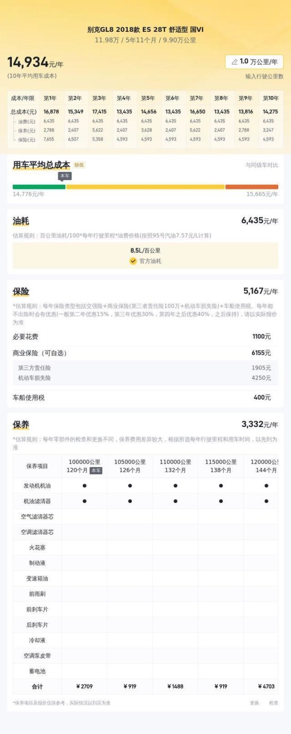 根据懂车帝的大数据分析,2019款别克GL8 2018款 ES 28T 舒适型国VI的年均用车成本大约为15159元,与同级别车型相当。虽然车龄较长,但由于发动机的良好状态,车辆的保养和维修费用较为稳定。随着车辆行驶时间的增加,可能会出现部分零部件需要更换的情况,但总体的保养费用变化并不会特别大,且其较低的燃油消耗使得用车成本不会轻易攀升。