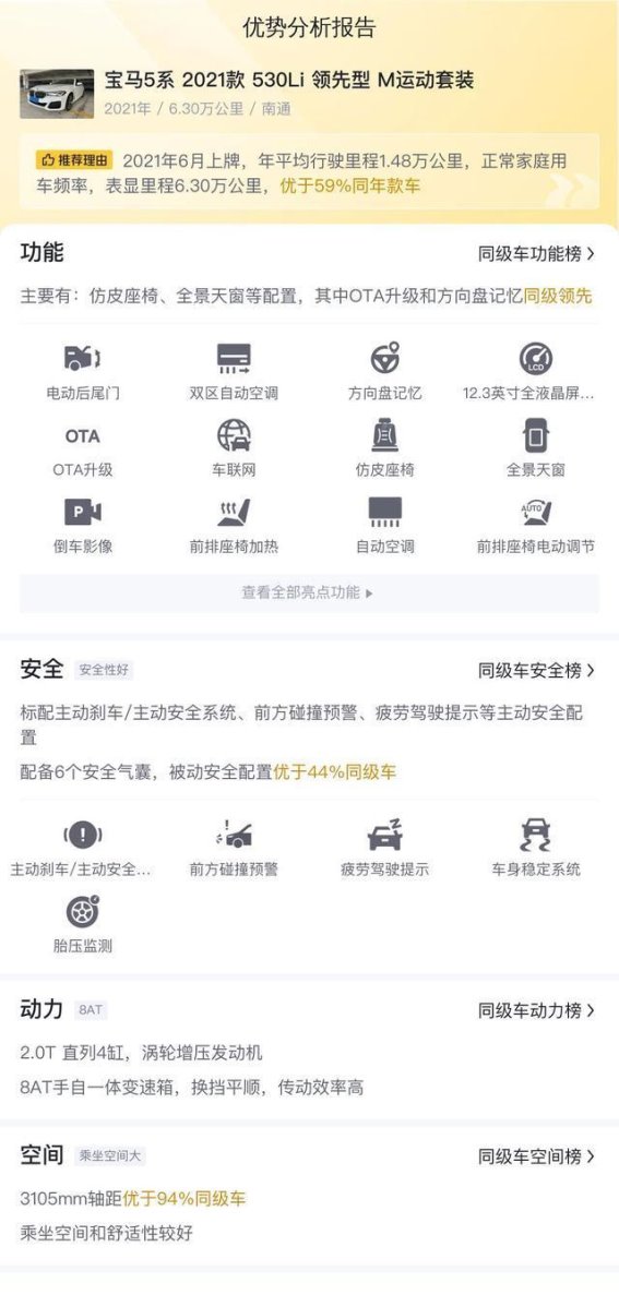 2021款宝马5系530Li M运动套装无疑是一款兼具奢华、性能和性价比的优秀车型。作为一款已经行驶了6.3万公里的二手车,它依然能够为车主提供接近新车的驾驶体验,尤其适合那些预算有限但又希望享受宝马豪华轿车的消费者。尽管二手车市场存在一定的风险,但凭借其较新的车龄、出色的配置和宝马品牌的影响力,这辆宝马5系在市场上依然具有很强的吸引力。对于那些追求驾驶乐趣和舒适享受的消费者来说,这款车无疑是一个理想的选择。