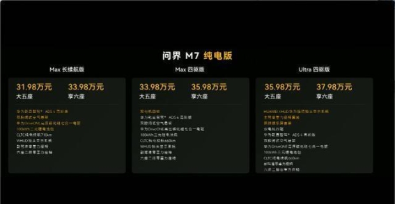 从车型配置来看,问界M7提供了丰富的选择,以满足不同消费者对续航、动力、舒适性等方面的需求。纯电Max五座长续航版的售价为31.98万元起,配备了先进的双腔空气悬架和华为乾崑智驾ADS4高阶版系统,使得其具备了强大的智能驾驶能力。该版本的纯电续航达到710公里,给用户提供了长时间的出行保障。而对于追求更高性能的消费者,问界M7还推出了纯电Max六座四驱版,续航可达到660公里,华为800V高压七合一电机的加持使得该车的动力表现更加出色。