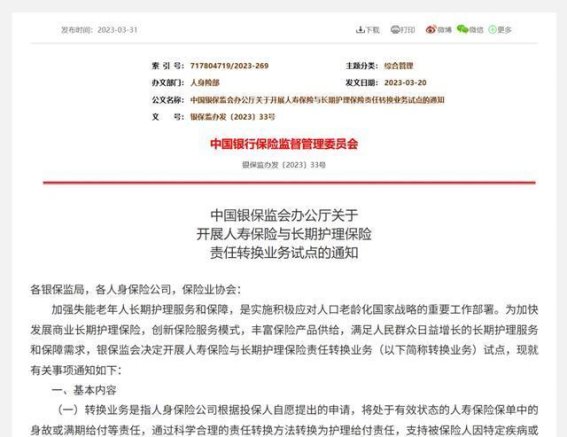 早在2023年3月,监管部门就开始试点“人寿保险与长期护理保险责任转换”的业务,旨在为失能人士提供更好的保障。根据试点方案,当被保险人进入失能状态时,可以将其原本的身故保险金转换为长期护理金,从而在失能期间获得护理服务。这一创新措施不仅为已经购买了人寿保险的客户提供了更灵活的保障选择,也为未来长期护理险的推广奠定了基础。
