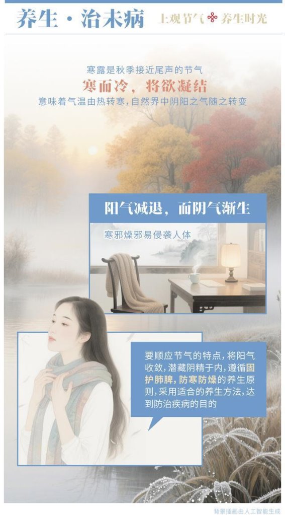 寒露是秋季最后一个接近冬季的节气,气温的下降和气候的干燥使得这一时段特别重要。从自然界来看,寒露标志着阴气的逐渐增加,阳气开始收敛,寒冷和干燥之气逐步侵入。此时,人体易受寒邪与燥邪的影响,若不加以注意,容易引发一系列健康问题。寒露时节的养生要着重于“收敛阳气,防寒防燥”,通过合理的生活方式和饮食习惯,帮助身体顺应季节变化,保持健康。