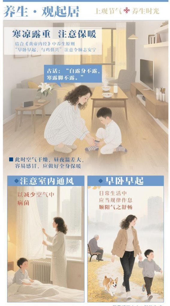 寒露的气候特点为寒冷与干燥,昼夜温差大,保暖成为此时节最为重要的养生环节。根据《黄帝内经》中的秋季养生原则:“早卧早起,与鸡俱兴”,寒露时节的作息应以规律为主,保证足够的睡眠时间,有助于调节体内阳气。在早晨和晚上,尤其需要做好保暖,避免寒冷对身体的侵袭。尤其是脚部,由于寒露后气温较低,脚部容易受凉,因此应特别注意脚部的保暖。古话有云:“白露身不露,寒露脚不露”,这提醒我们寒露时节必须保护好脚部,以防寒气从脚部侵入体内,影响健康。