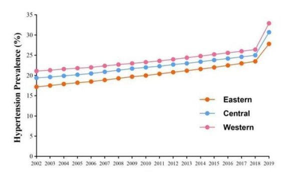 从整体地理分布来看,我国的高血压患病率呈现出显著的地区差异。根据2019年的数据,西部地区的高血压患病率达到32.9%,明显高于东部和中部地区。西部地区居民的高盐饮食习惯以及腌制食品的普遍食用,是导致高血压高发的一个重要原因。相比之下,东部和中部的居民在饮食上则相对清淡,盐的摄入量较低,因此患病率相对较低。