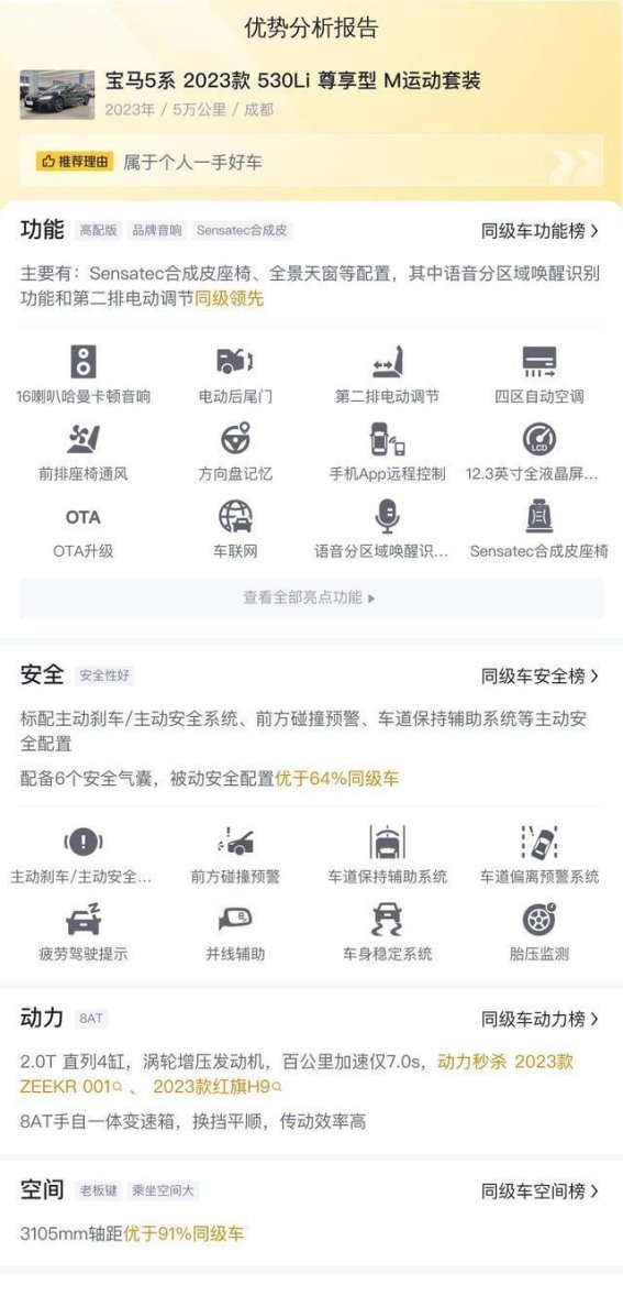 综合来看,这辆2023款宝马530Li 尊享型 M运动套装,在动力、空间、配置及操控上均表现出色。如果购车预算在30万元左右,追求豪华品牌及卓越驾驶体验,那么这款准新车是非常值得考虑的选择。在购车前建议亲自检查车辆实际状况,确保车况良好,同时结合市场行情、用车成本及自身需求,综合评估车辆价值。宝马5系凭借其品牌积淀、性能表现和豪华配置,能够为车主带来舒适驾乘体验与驾驶乐趣的完美结合。