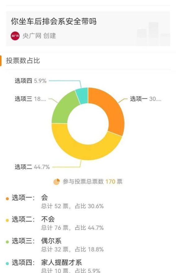公众对后排安全带的态度也反映出现实问题。根据央广网发起的一项投票显示,接近45%的网友表示在后排不会系安全带。记者走访发现,虽然多数乘客清楚安全带的重要性,但在后排坐车时,只有少部分人会主动系好,更多人抱有侥幸心理,认为后排事故风险较低。现实情况并非如此,即便低速碰撞,后排未系安全带也可能造成严重伤害,还可能对前排已系安全带的乘客形成二次冲击。