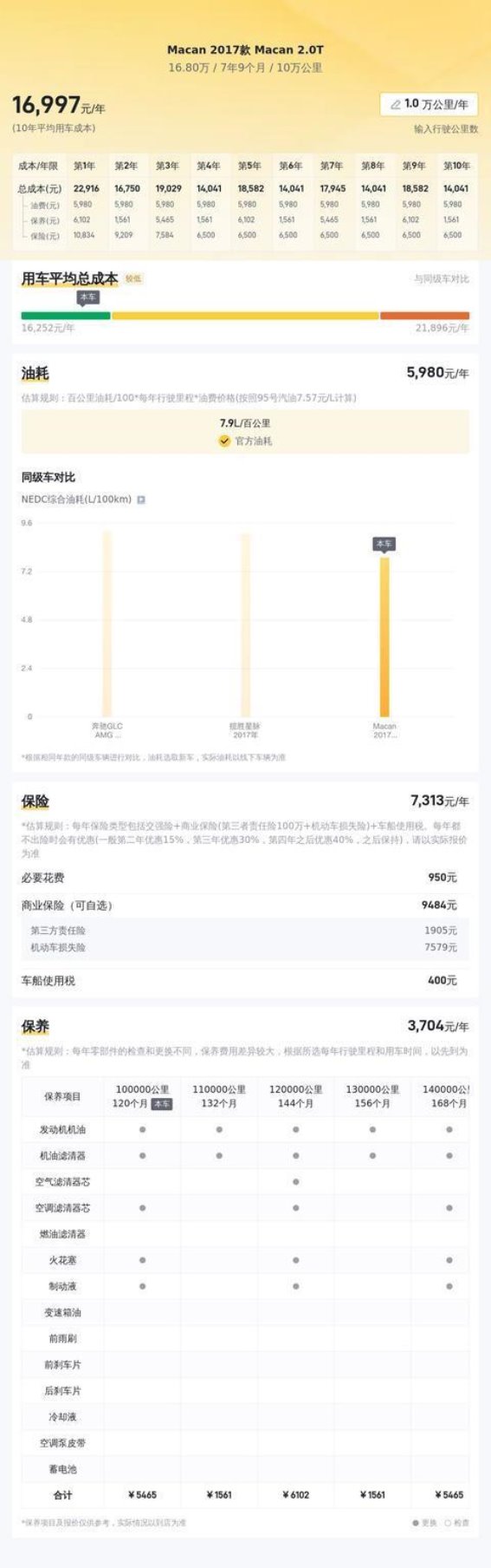 市场行情显示,这款2017款Macan 2.0T二手车价格区间在16.8万元至21.86万元之间,具体价格取决于车辆状况、里程及配置差异。我们关注的这辆16.8万元报价,较新车55万元的指导价,性价比极高,是许多消费者以较低成本体验保时捷的理想选择。按年均综合用车成本约1.71万元计算,包括油费、保养和保险,经济性也处于合理水平,为日常使用提供了保障。
