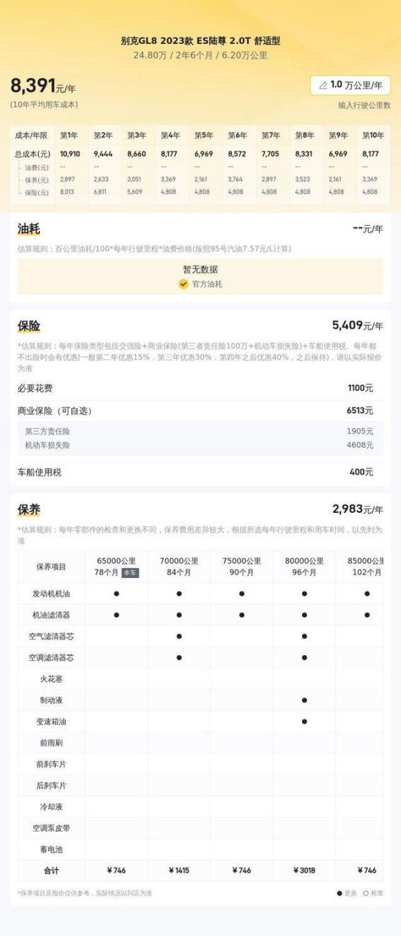 在市场行情方面,这辆GL8二手报价为24.8万元,相比市场同款车21.21万-25.22万区间处于中上水平。由于车辆行驶里程短、未过户,保值率仍然较高。用车成本方面,经过估算,该车年均用车成本约为7990元,相比同级车型最低7100元、最高14443元,处于较低水平,对于追求经济性和长期使用价值的消费者来说,依旧具有吸引力。这样的价格与成本平衡,使其在二手市场中依然具备竞争力。