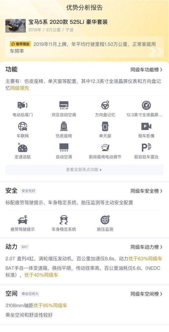 用车成本方面,这辆宝马5系十年平均用车成本约为6533元/年,在同级别车型中属于合理范围。这个成本涵盖了燃油、保险、保养和税费等日常支出,对于希望购买二手车的消费者而言,是完全可接受的水平。合理的用车成本与高品质的驾乘体验相结合,使得这辆二手宝马5系成为经济性与豪华感兼顾的选择。对于预算有限但追求舒适驾驶体验的消费者来说,这一点非常具有吸引力。