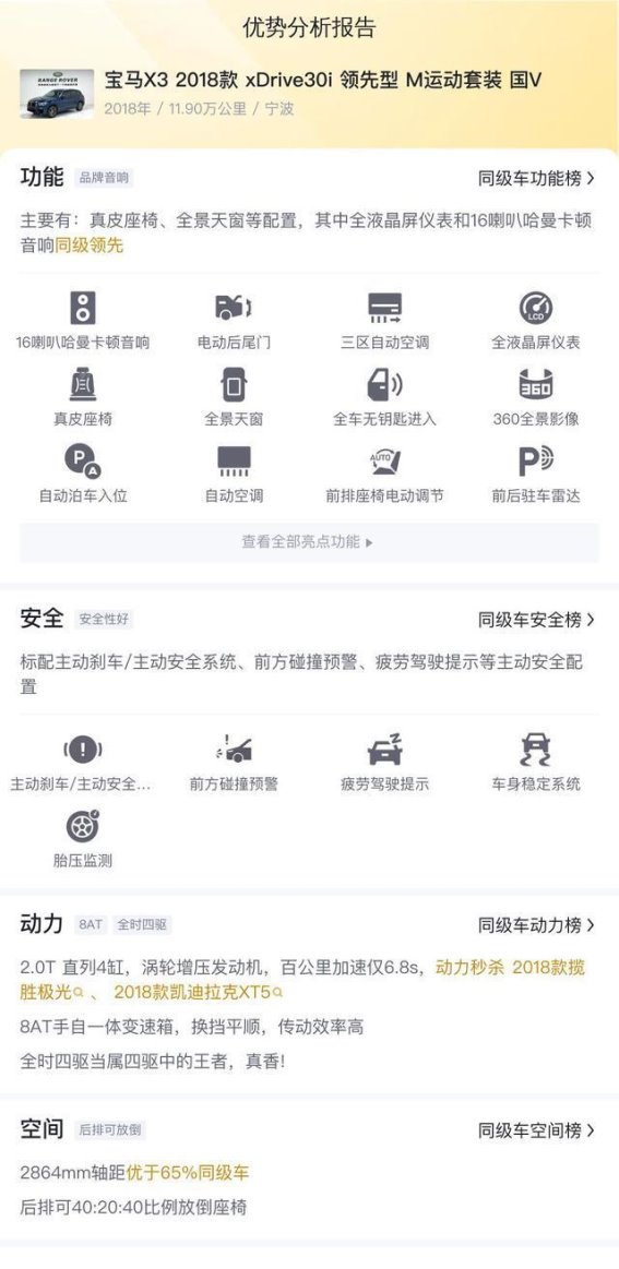 总体来看,这款宝马X3 2018款 xDrive30i领先型M运动套装在动力、操控、空间、配置和舒适性方面均衡出色,兼顾豪华与运动气息。作为二手车,其售价较新车大幅下降,维护成本合理,适合注重驾驶体验和生活品质的用户。通过合理购车和细致检查,消费者可以用相对低廉的成本获得一辆性能优异、豪华感十足的SUV,享受驾驶乐趣与舒适出行的双重体验。