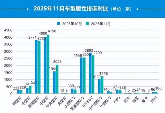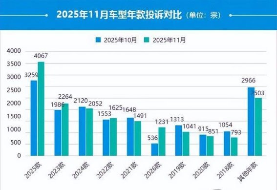 在车型属性方面,中型车投诉量领先,本月超过4,000宗,环比增长3.7%。小型车和中大型车投诉增幅明显,分别较10月份上涨33.2%和29.2%,后者达到近半年来最高水平。年款对比方面,2025款车型投诉量仍高,环比上涨24.8%,占总投诉量超过20%;2026款车型本月投诉量突破千宗,环比翻倍,服务问题占比超过八成,主要集中在“定(订)金纠纷”。这显示新车型在交付初期存在服务流程不完善、信息透明度不足等问题,需要车企在售前售后管理上更加精细化。