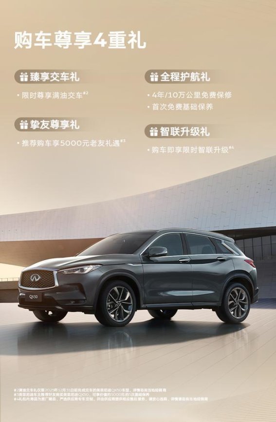 除了直接的价格优惠,英菲尼迪还为购车用户提供了四重礼遇,包括臻享交车礼、全程护航礼、挚友尊享礼、智联升级礼等。这些多重优惠措施覆盖了购车、用车和养车的整个生命周期,不仅让消费者在价格上获得实惠,更在服务和体验上得到优待,进一步提升了QX50的整体价值。