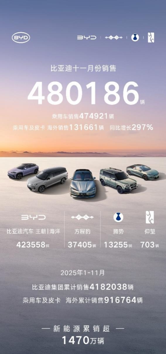 比亚迪,这个在新能源汽车行业崭露头角的品牌,以其强大的市场表现和技术创新,正在快速改变全球汽车行业的格局。2025年11月,比亚迪的全球销量突破48万辆,创下新高,且其中超过13万辆来自海外市场。如此亮眼的成绩,背后不仅仅是销售数字的增长,更是技术积淀与市场战略的完美结合。进入2025年1-11月,比亚迪累计销量突破418万辆,稳居全球新能源汽车市场的领先地位,预计全年销量将突破460万辆目标。比亚迪的成功,不仅是规模上的领先,更是技术层面的深厚积淀。