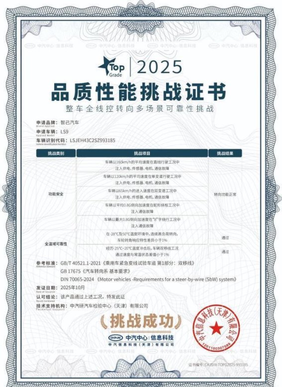 值得注意的是,智己LS9 Hyper版所配备的线控转向系统,完全符合2025版《汽车转向系基本要求》国家标准,并已通过中汽中心的权威认证。这一技术认证标志着智己LS9 Hyper版在安全性和可靠性上达到了行业领先水平,也为国内线控转向技术的普及应用提供了有力支持。作为国内首款成功通过全线控转向多场景可靠性挑战认证的车型,智己LS9 Hyper版无疑成为智能驾驶技术发展的标杆。
