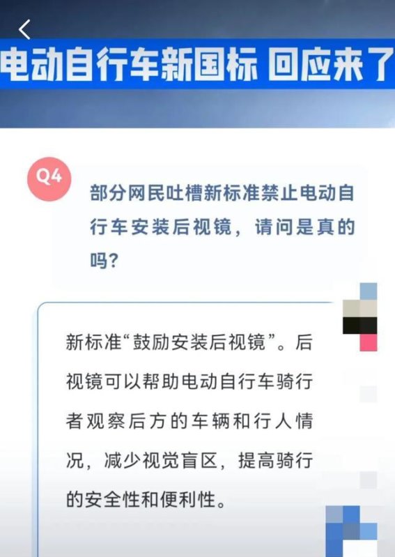 有网友提出,许多新车型未安装后视镜,担心骑行时无法看到后方情况。对此,官方作出澄清,新国标并没有禁止安装后视镜,甚至鼓励车企安装后视镜。在车辆尺寸的测量过程中,后视镜并不算作车身尺寸的一部分,这意味着电动自行车制造商在设计时有充分的空间来选择是否加装后视镜。部分车型没有安装后视镜,仅仅是出于外观设计考虑,消费者可以根据自己的需求自行加装后视镜。