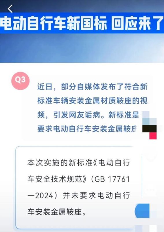 不少消费者在选车时还提到了“新车座椅太硬,不适合长时间骑行”的问题,特别是有些车型采用了金属鞍座,坐垫感觉非常不舒适。对此,官方表示,金属鞍座并不是强制要求的,电动自行车座椅的主要标准是防火阻燃,不是所有的车型都使用金属鞍座。绝大多数新车仍配备软垫座椅,舒适性更好,金属鞍座的应用是极少数情况。消费者不必因座椅材质问题而担心舒适度问题。