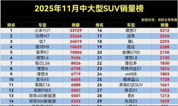 2025年11月中大型SUV的销量榜单终于揭晓,市场的变化可谓引人注目。根据乘联会发布的最新数据显示,小米YU7以3.3万辆的优异成绩稳居榜首,成功卫冕。而作为新能源SUV的代表,钛7在本月的表现也不容小觑,顺利跻身前三,银河M9更是突破万辆大关,成为市场中一个不容忽视的力量。整体来看,新能源车型正在迅速崛起,逐步打破传统合资品牌在高端中大型SUV市场的垄断。