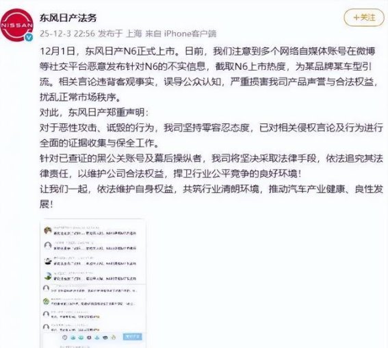 东风日产对于这种行为的回应异常坚决。日产高管一语道破行业乱象:“何须绊倒同行”。这种迅速而有力的回应,无疑凸显了企业对于维护公平竞争的态度。紧接着,东风日产法务部门也发布了声明,称多家自媒体账号在社交平台恶意发布不实信息,利用N6的上市热度为某品牌引流。日产明确表示,将对这些不实言论采取法律行动,以保护品牌形象和消费者权益。