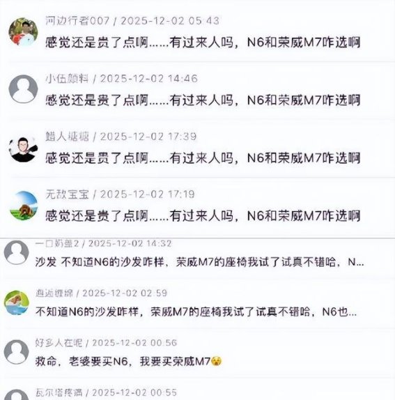 12月1日,东风日产的N6正式上市,伴随新车发布的评论区却异常热闹。大量看似普通的用户评论,实则是通过话术高度一致的方式,给荣威M7制造了负面印象。评论表面上在进行理性对比,实际上却充斥着对N6的贬低与对M7的无端夸赞。例如,“日产N6的沙发是舒服,建议啊……荣威M7的躺椅了解一下”这类评论,乍一看似乎无可厚非,但其背后透露出的情绪却不言而喻:通过贬低对手,提升自己。