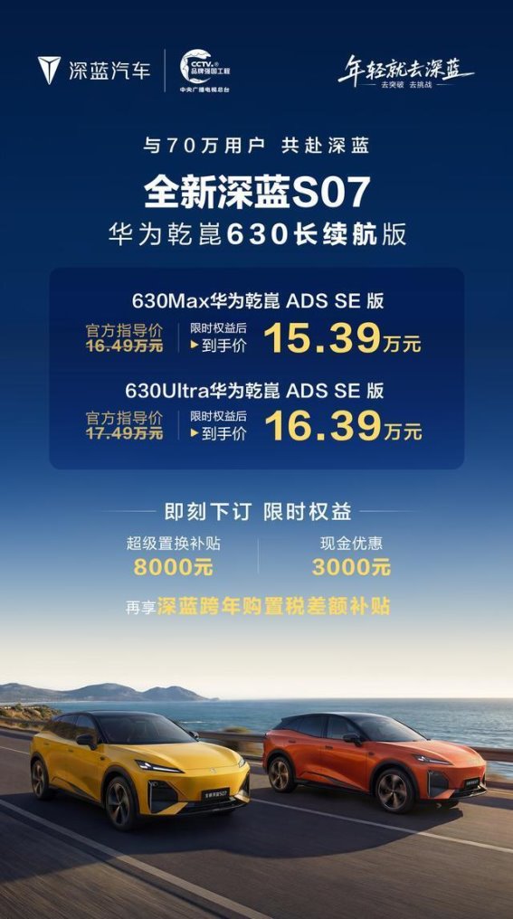 在新能源市场竞争日趋激烈的背景下,深蓝S07华为乾崑630长续航版于12月11日正式上市,这一版本的推出并非简单的产品补充,而是围绕用户真实用车需求展开的一次系统性升级。新车共推出两款车型,官方指导价区间为16.49万元至17.49万元。在上市初期,深蓝同步推出多重限时购车权益,包括8000元超级置换补贴、3000元现金优惠以及跨年购置税差额补贴,叠加之后,车辆的实际入手价格下探至15.39万元至16.39万元。这一价格区间,直接切入当前主流纯电中型SUV的核心竞争带,也体现出品牌在年末市场阶段争取增量用户的明确态度。