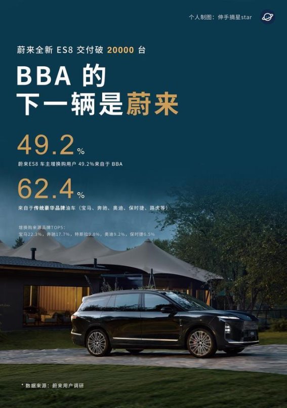 最近看到一组全新蔚来ES8的数据,让我感到非常惊讶:自上市70天以来,ES8累计交付已经突破两万台,创造了40万元以上纯电车型最快破两万交付的纪录。更让我好奇的是,其中49.2%的用户来自奔驰、宝马、奥迪(BBA),30%原本是BBA轿车用户,还有15%来自“56E”中大型轿车用户。原来,蔚来ES8对豪华车用户的吸引力竟然如此之大。我正好也在考虑换车,于是预约了一次ES8的试驾,亲身体验之后才真正理解为什么那么多BBA车主愿意选择它。