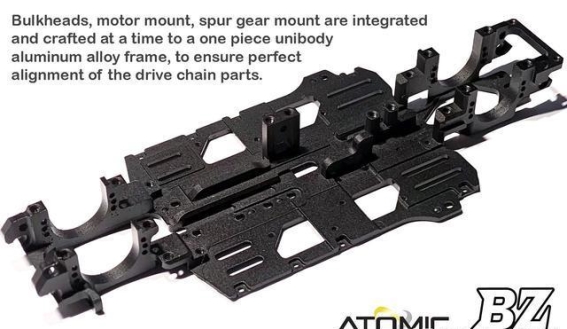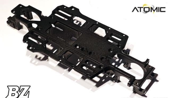BZ Master Edition的一大亮点是全新一体式主车架设计,将前后差速壳、主齿座、马达座及底盘板进行了整体整合,并采用7075铝合金一体加工制造。这种一体化设计不仅大幅提升了车架的整体刚性,还确保了传动系统各部件的精确对准,减少了动力传递中的能量损耗和微小偏差。无论是急加速还是高速过弯,车手都能感受到线性且稳定的操控反馈,这种精密的加工工艺体现了RC Atomic在材料选择和制造工艺上的严谨与专业,也让车辆在竞赛中具备了更高的稳定性和可靠性。