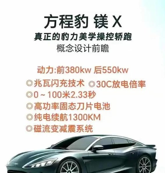 总体来看,方程豹镁X在设计、动力、智能化和续航等方面都展现出强烈的创新与突破,充分体现了品牌对城市性能轿跑的深度探索。虽然部分参数仍需实车验证,但整体产品逻辑清晰、技术路线成熟。镁X不仅是方程豹的一次大胆尝试,也有望在新能源高性能轿跑市场掀起新的浪潮,为消费者带来兼具科技感、性能与实用性的全新选择。它的出现,不仅展示了方程豹的技术实力,也昭示着新能源高性能轿跑的未来方向。