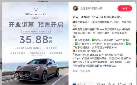 从一线市场的反馈情况来看,此次Grecale Folgore的销售热度明显超出了经销商的预期。以上海市场为例,多家门店在活动开启首日便迎来大量消费者咨询和到店看车,有的门店甚至在尚未正式营业前,门口就已经排起了队伍。直到正常下班时间结束,销售人员依旧被客户围着反复沟通,营业时间被一再延长。短短两天之内,上海区域内的低配车型便被全部消化完毕,一些消费者仅仅因为当时犹豫,隔天再来,目标车辆就已经售罄,这种紧迫感进一步放大了市场情绪。
