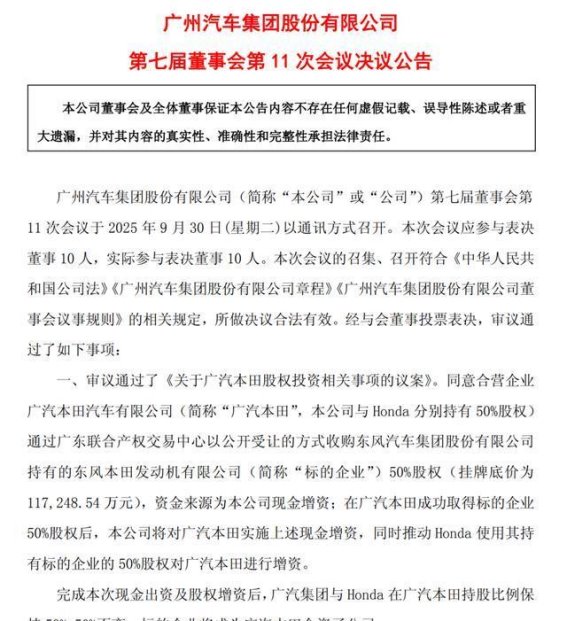 2024年8月18日,广东联合产权交易中心披露,东风汽车集团股份有限公司决定出售东风本田发动机有限公司50%的股权。东风集团表示,此举旨在优化燃油车资产结构,加快自身向新能源转型的步伐。而在同年9月30日,广汽集团正式宣布同意收购这50%股权,交易金额为11.72亿元,资金来源为现金增资。收购完成后,东风集团将完全退出东本发动机,广汽本田将全面接管这一生产基地。