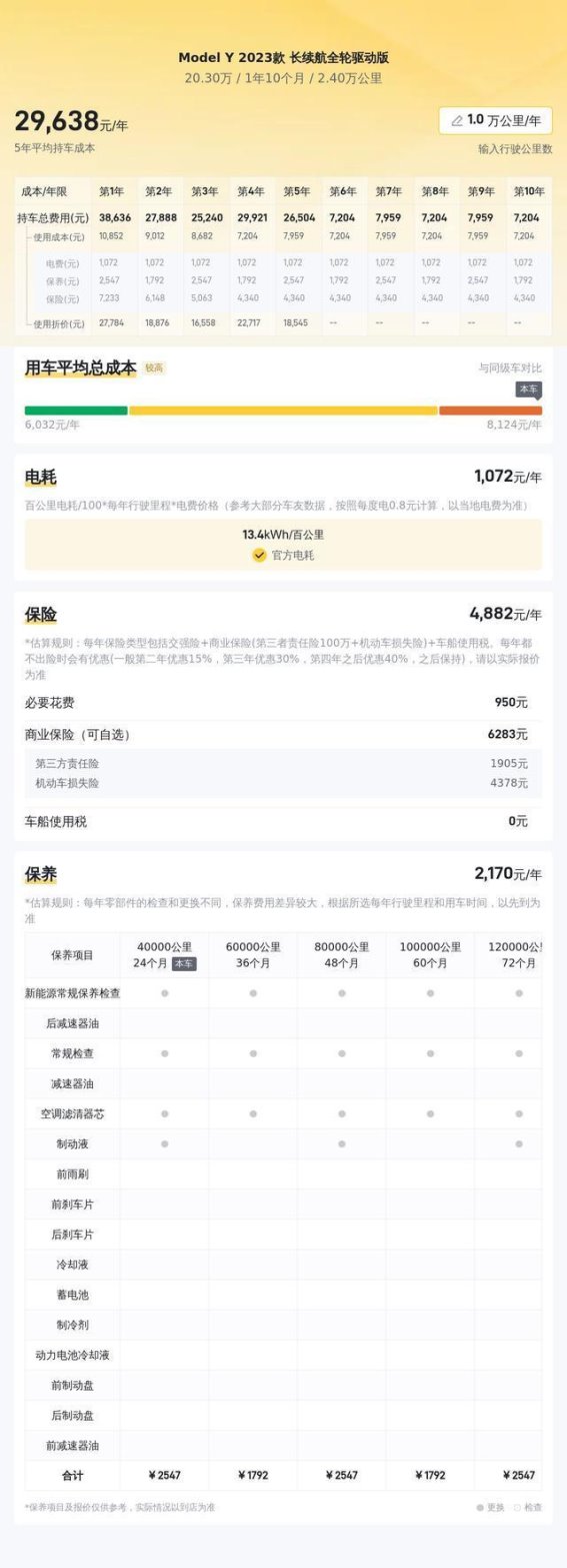 从用车成本的角度来看,特斯拉Model Y的表现相当不错。根据官方数据,百公里耗电量为13.4kWh,按每年行驶2万公里计算,电费大约为680元(按每度电0.5元计算)。保险费用每年约为6735元,涵盖交强险及商业险等项目。电动车的结构相对简单,日常保养主要集中在检查三电系统、底盘等部分,费用较低,大约为每年1000元左右。这款车的年均综合用车成本大致为3万元,考虑到电动汽车本身的低维护需求,其长期使用成本相对较低。