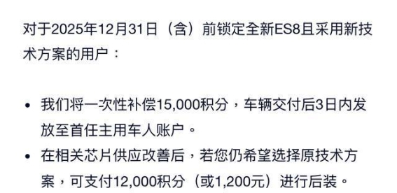 蔚来也为那些希望恢复原有技术方案的用户提供了后装选项。在供应链问题得到缓解后,消费者可以支付12000积分或1200元人民币,选择将车载娱乐系统恢复到原有的技术方案。这一灵活的选择为车主提供了更多的自主权,特别是在技术方案恢复的时机尚不明确的情况下,消费者可以根据自身需求作出调整。