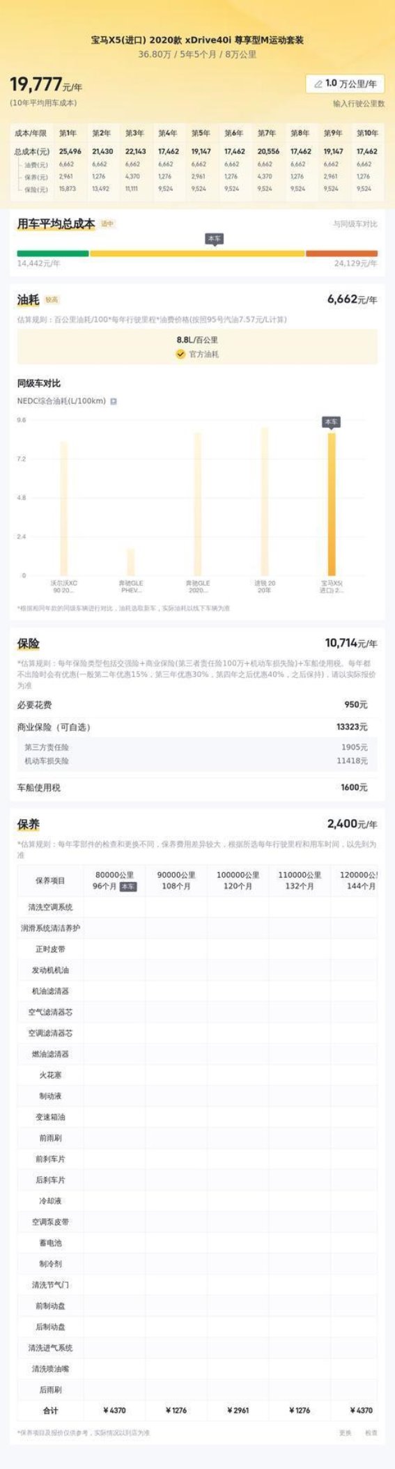根据大数据分析,这款宝马X5的平均用车成本大约为21,885元/年,相较于同级别其他车型,它的用车成本处于适中的水平。具体的用车成本还需要根据车主的驾驶习惯、保养情况和实际使用频率等因素来评估。