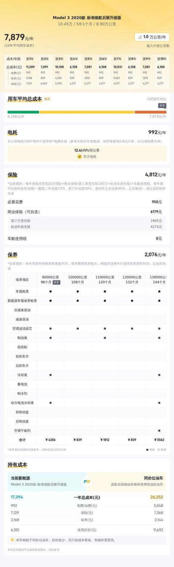 从用车成本角度来看,这辆Model 3的百公里电能消耗为12.4kWh/100km,整体用车成本较低。根据估算,车辆的年均用车成本大约在1.7万元左右,电动汽车的优势在于较低的充电费用,这使得日常通勤成本大大低于传统燃油车的加油费用。