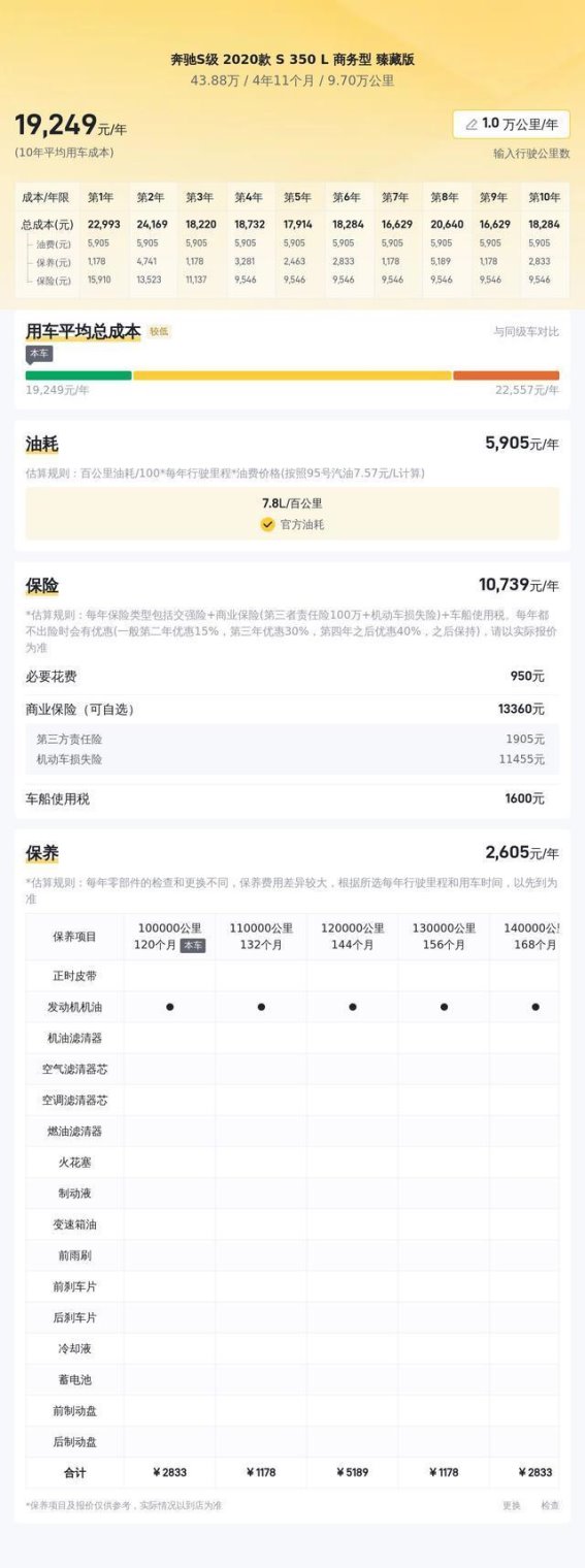 在选购一款车辆时,购车成本固然重要,但用车成本也是买家需要考虑的重要因素之一。根据数据分析,奔驰S350L的10年平均用车成本约为19000元/年,相比同级别其他车型,这个数字处于适中的水平。对于奔驰S级这样一款豪华车来说,这个用车成本相对合理。无论是日常保养、油费还是维修费用,这辆车的综合支出都在一个可接受的范围内,适合那些既追求豪华又注重性价比的消费者。