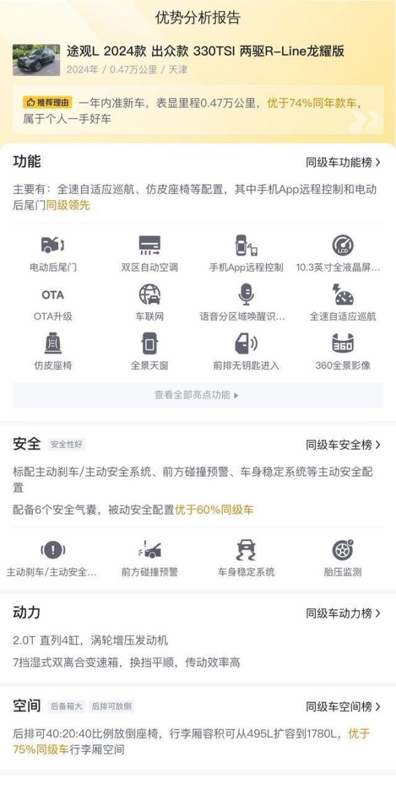 途观L 2024款330TSI两驱R-Line龙耀版是一款综合素质非常高的SUV。无论是从动力性能、舒适性、内饰配置还是安全性方面来看,它都无可挑剔。特别是在二手车市场上,这款车凭借着低里程、良好车况和合理的价格,成为了许多消费者的优选。如果你正在寻找一辆既适合日常驾驶又能够满足家庭出行需求的SUV,途观L 2024款330TSI两驱R-Line龙耀版绝对是一个值得考虑的选择。