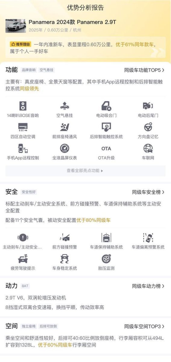 保时捷帕拉梅拉 2.9T作为一款豪华轿车,凭借其卓越的动力性能、豪华的内饰配置和极高的车况保持度,成为了二手车市场中的佼佼者。如果你追求的是一款高性能、高保值率的豪华轿车,并且预算充足,那么这辆帕拉梅拉无疑是一个非常值得考虑的选择。通过对车况、配置、动力和市场行情的分析,我们可以看出,这辆车虽然价格偏高,但物有所值,适合那些对品质有高要求的消费者。