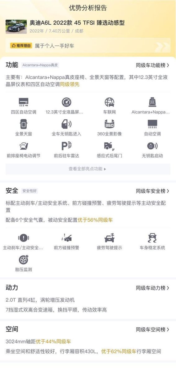 综合来看,这款2022款奥迪A6L 45 TFSI 臻选动感型无论是在动力性能、车内设计,还是智能科技方面,都表现得非常出色,成为了二手车市场中的一款热门车型。而且相较于新车,其更具性价比,是那些想要享受奥迪品牌豪华体验的消费者的绝佳选择。通过对这款车的全面了解,我们可以看出,它不仅仅是一辆车,更是一种象征着优雅与尊贵的生活方式的代表。