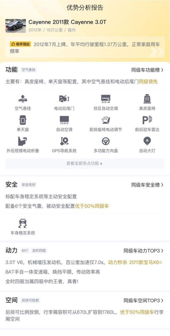 2011款Cayenne 3.0T是一款兼具豪华、运动和实用性的二手车,凭借保时捷品牌的影响力和卓越的动力表现,它仍然是许多消费者向往的车型。尽管其保养和油耗成本较高,但对于那些渴望体验豪华车、享受高性能驾驶的消费者来说,10.8万元的二手车价格无疑是一次极具吸引力的机会。如果你正在寻找一款兼具豪华与动力、适合日常代步和偶尔越野的SUV,那么这款Cayenne 3.0T无疑值得考虑。