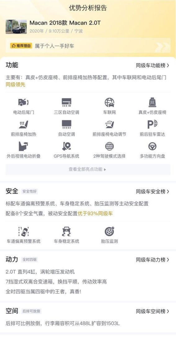 ,2018款Macan 2.0T是一款综合表现出色的豪华二手车。它凭借低里程、良好的车况、丰富的配置以及强劲的动力,成为了二手车市场中非常具有竞争力的选择。虽然后排空间相对紧凑,但对于大多数消费者来说,这款车的整体表现已经足够优秀,尤其适合那些既追求驾驶乐趣,又注重豪华舒适的消费者。