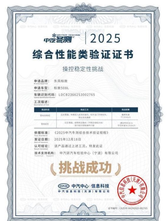 2025年12月18日,东风雪铁龙凡尔赛C5 X与东风标致508L在中国汽车技术研究中心主办的“2025极寒驾控安全主题技术验证”中,以出色的操控稳定性双双获得“操控稳定性挑战”验证证书。这一成绩不仅彰显了两款车型在极寒条件下的卓越表现,也凸显了法系品牌在极端环境下的安全技术积淀。本次全程在行业专家与观众的见证下进行,单板滑雪世界冠军张义威亲临现场,共同见证这场冰雪挑战。