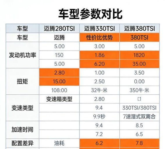 综合来看,2025款迈腾的性价比选择非常明确:预算在13-15万之间,主要用于城市通勤的消费者,可以选择280TSI DSG豪华型;预算在15-17万之间,追求动力均衡和实用配置的消费者,可以选择330TSI DSG豪华型,这款车的性价比最高;对于预算在18万以上,且对动力和配置有更高要求的消费者,380TSI旗舰型是最合适的选择。