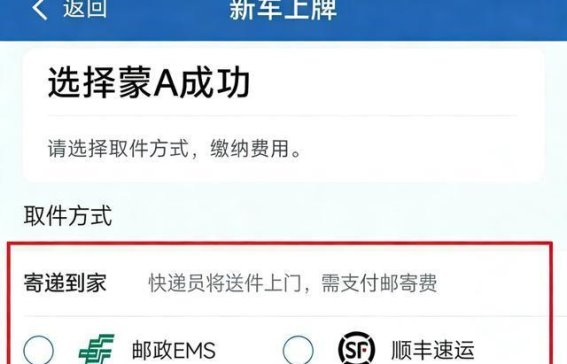 缴费并邮寄:支付相关费用后,选择邮政EMS或顺丰速运邮寄号牌,并可通过APP随时查看办理进度和邮寄轨迹。