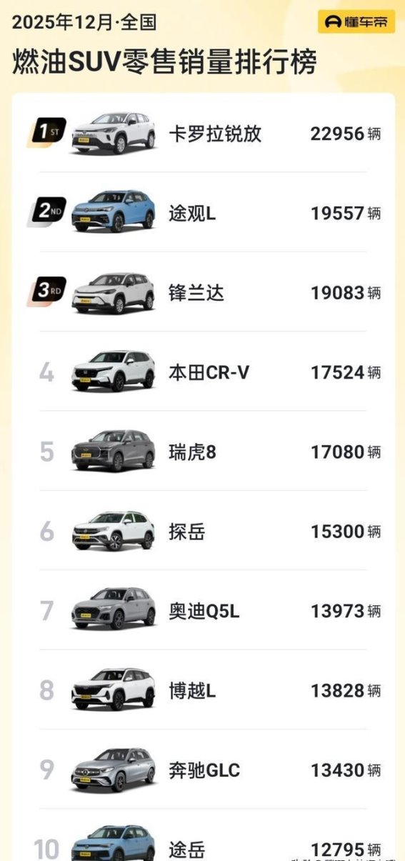 而在合资品牌的表现上,依旧保持了相对稳定的增长。12月,丰田卡罗拉锐放以22956辆的销量稳居榜首,成为唯一突破两万辆销量的大热门车型。紧随其后的大众途观L和丰田锋兰达,分别以19557辆和19083辆的成绩占据第二和第三名的位置。即使在燃油SUV市场竞争愈发激烈的背景下,合资品牌凭借着技术优势和市场积淀,依旧展现出了其强大的市场韧性。尤其是在合资品牌的主流车型中,大众和丰田的稳定销量,也让消费者对于燃油SUV的需求保持了一定的信任。