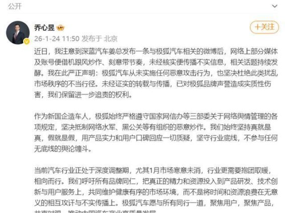 近日,极狐品牌的高管乔心昱发布了一则严正声明,回应了深蓝汽车CEO姜海荣转发的与极狐相关的动态。这一声明迅速在业内引发了广泛讨论,尤其是在“黑公关”问题的背景下,这场舆论风波显得尤为引人关注。
